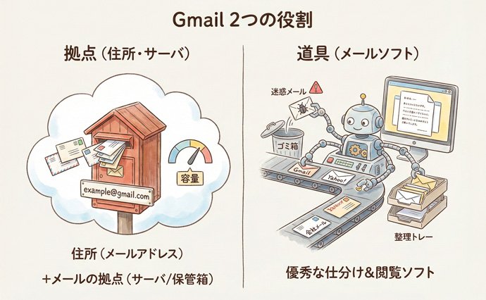 実はこれらの疑問、Gmailの役割を2つに分けて考えると、一気に腑に落ちます。