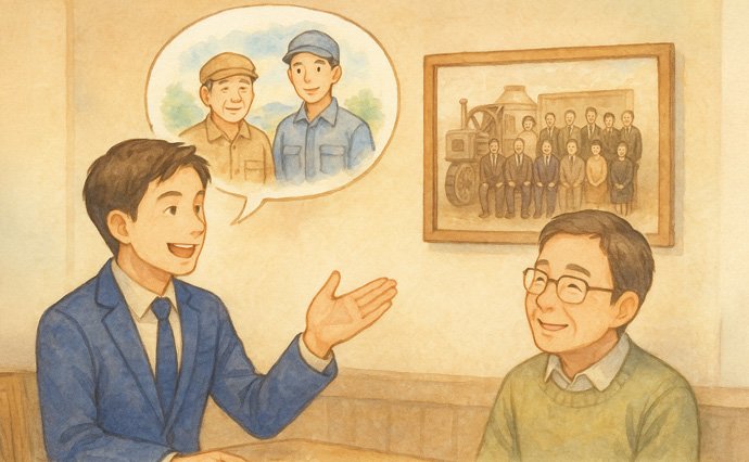 ある製造業の会社では、打ち合わせスペースに創業当時の機械設備と、長年の顧客との集合写真が飾られていました。
